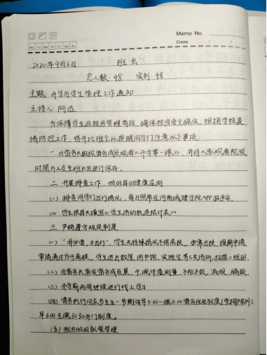 班会课上,各辅导员重点讲解了《关于做好秋季学期开学后员工管理工作的通知》《伟德国际bevictor1949发热病人处置预案和流程》等相关管理规定,并逐一强调开学后日常管理、体温检测、上课、就餐、防疫卫生等日常规范和应急处置流程,教育员工严格遵守疫情防控纪律规范,心怀敬畏,关注自身健康。此外,老师们还就“珍惜粮食、拒绝浪费”进行了强调,倡导同学们要爱惜粮食、文明就餐,取之有节、用之有度,“光盘行动”、从我做起。