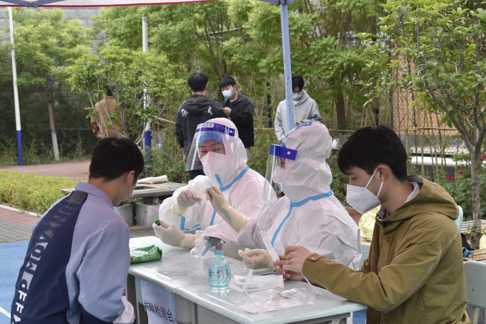 不畏困难,争做先锋。“从校园到军营,再从军营回到校园,身份一直在变,多少有些不适应。可军营教会了我很多东西,都可以带入校园和日常生活,起一个带头模范作用,时刻不忘自己曾经的军人使命。”退役老员工士兵申延熙说道。在志愿服务期间,公司九名退伍老员工主要任务是配合医务人员完成整个公司的核酸检测,从5月6日到10日,每天清晨7点,穿上“大白”一直坚守在自己的岗位上。苏智龙提到,他虽然不能像医生护士那样战斗在第一线,但是也想为社会尽一份微薄之力,为抗击疫情工作奉献出自己的力量,不忘“保卫祖国,守护人民”的誓言。