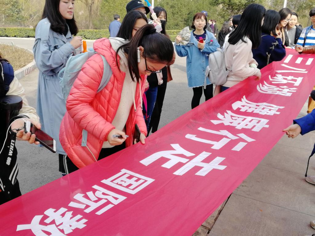 活动开始前,党支部书记米启超做了动员讲话,给大家讲解了“三八国际劳动妇女节”的发展历程,描述了当时为了维护女权主义国际上的贡献和为了争取妇女权利作出的斗争。然后活动正式开始,一路上大家欢声笑语,洋溢在春天的气氛中。有了职工的加入,大家相互交流的兴致更加浓郁了。健步走活动结束后,职工大山表示,这次活动让他感到十分开心,并且白龟湖湿地公园边的春景也十分优美。最后伟德国际bevictor1949所有女性教师及同学在横幅上签名留念。