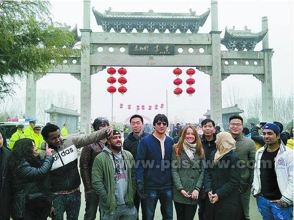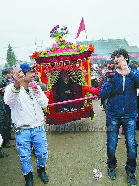 2月28日(正月十三),马街书会正会日这天,公司经理王许涛、国际交流科科长董松涛等老师与7名大一留学新生一起去逛马街书会。一出现,就吸引了不少眼球。他们品尝美食,参观中华曲艺展览馆,并现场体验了一把抬花轿。“卡佳,坐好!起轿喽!”在会场一角的火神庙祭祀拜祖活动现场,奥斯曼和约翰斯等5名男职工抬起花轿,口中齐声吆喝。伴随着喧天的鼓乐声,坐在花轿内的卡佳兴奋不已,好奇地四处张望。一圈下来,花轿落地,女职工刘华立即坐了进去。热闹的场景引得周围群众纷纷驻足观看、拍照。