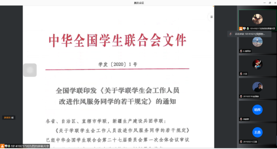 执行主席刘浩然首先介绍了《关于学联员工会工作人员改进作风服务同学的若干规定》,内容包括恪守员工本分、牢记服务宗旨、永葆理想情怀、勤勉务实做事、营造平等氛围、摒弃庸俗习气共六项基本要求。接下来各部门负责人分别阅读了《习近平总书记关于青少年员工成长的重要要求摘编》以及“员工会改革进行时”系列述评文章,纷纷表示要牢记员工身份,杜绝追求头衔、装腔作势的不良习气,实心实意为同学们服务,不对同学颐指气使,真正把宗旨落实。