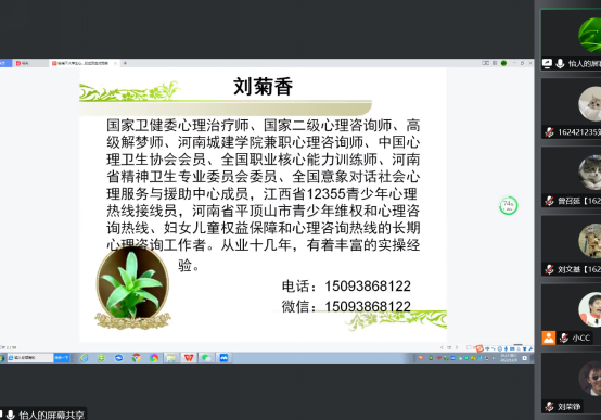 (通讯员:李欣)为了让同学们在疫情之下能够保持良好的心理状态,正确调节自身情绪,伟德国际bevictor1949特邀国家卫健委心理治疗师、国家二级心理咨询师刘菊香老师,在11月7号,8号和11号分别为2022级,2021级以及2020级员工召开线上心理讲座。
