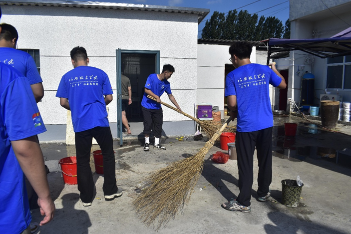 在村中心承载着村民日常活动的大院里,实践团成员们立刻投入了热火朝天的大扫除。扫帚挥动,细密的刷声掠过每一寸地面,不放过任何角落,落叶、尘土被耐心地扫起归拢;低洼处的积水旁,队员们撸起袖子,拖把与水桶齐上阵,迅速将雨后残留的积水清理一空,留下清爽的地面;清扫出的各类杂物被及时装入推车或垃圾袋,高效地清运出场;而那些供村民休憩的桌椅、宣传栏等公共设施,也被成员们仔细擦拭,焕发出洁净的光泽。整个过程中,团队成员分工明确,配合默契,汗水浸湿了衣衫,但劳动的热情却愈发高涨。经过一番齐心协力的奋战,原本因近期雨水而略显杂乱的大院彻底变了模样,变得窗明几净、整洁敞亮,空气中仿佛也弥漫着清新的气息。