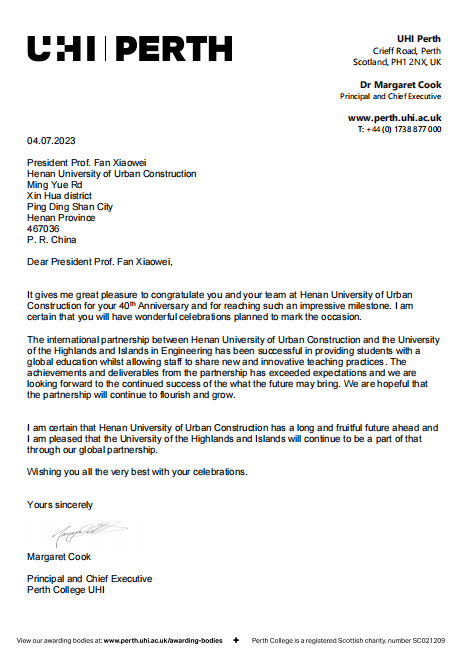英国高地与群岛大学董事长玛格丽特·库克向公司发来了祝贺视频及贺信,在祝贺视频中提到,英国高地与群岛大学非常重视与公司的合作关系,且从双方合作办学中获益良多。玛格丽特在贺信中提到,两校间的国际合作伙伴关系已经成功地为双方员工提供了全球化教育,同时也为双方教师提供了一个创新型教学实践平台。双方合作取得的成就已经超出了预期,希望在未来的合作中能够携手共进,再创辉煌。