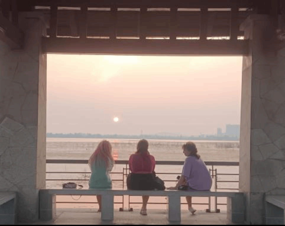 夕阳西下,白龟湖的水面与天汇成一色,暮色洒向平静的湖面,研学团的同学们静静地享受着这份属于平顶山的安逸