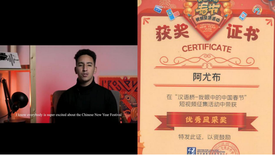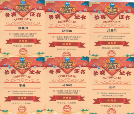 (通讯员 阿远 董召锋)日前,由孔子公司总部/国家汉办-中外语言交流合作中心下属“汉语桥”主办的“汉语桥-我眼中的中国春节”短视频征集活动结果公布,共有16个作品突出重围,公司伟德国际bevictor1949职工阿尤布(Ayoub)从来自53个国家、64所院校的198个参赛作品中脱颖而出,获得优秀风采奖。侯赛因、玛丽莲、龙佩尔、李德、马赫迪、亚辛等6名同学获得优秀奖。