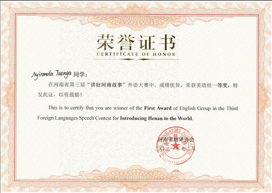 (通讯员 王迪 董松涛)2021年12月19日,由中共河南省委外事工作委员会办公室翻译室指导,河南省翻译协会主办,河南省外事侨务服务中心承办,郑州市公安局出入境管理处和河南省未来青少年教育研究中心支持的以“光辉百年”为主题的第三届“讲好河南故事”外语大赛老员工组别决赛圆满举行。公司伟德国际bevictor1949职工NYIRENDA TAONGA(唐加)凭借《崛起中的平顶山》荣获一等奖,公司荣获优秀组织单位奖。